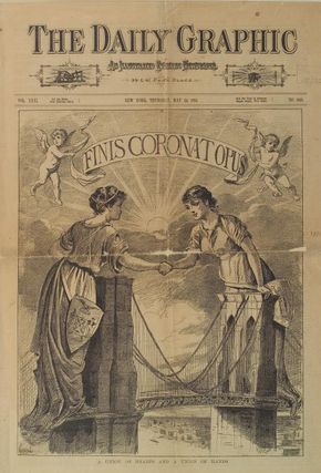 On the day of the grand opening of the Brooklyn Bridge, The Daily Graphic released this edition of the magazine. In the picture, the bridge rises high into the sky. It is so large that the city behind it looks flat. On the bridge stand two women, who symbolize Brooklyn and Manhattan. They are shaking hands as they meet for the first time because the Brooklyn Bridge was the first solid foundation that connected the two islands. Above them reads the sign “Finis Coronat Opus.” This Latin terms means, “The end crowns the work,” or a work of art cannot be fully appreciated until it is complete. Again, the bridge is refereed to as a work of art. The bridge is also depicted in a heavenly manner, with the skies opening up and two angels on either side of the banner. Martin’s hotels in Martin Dressler are made with the inspiration of the Brooklyn Bridge. Martin intended for them to be out of this world the same way the Brooklyn Bridge. People would marvel at the hotels the same way they would marvel at the bridge.