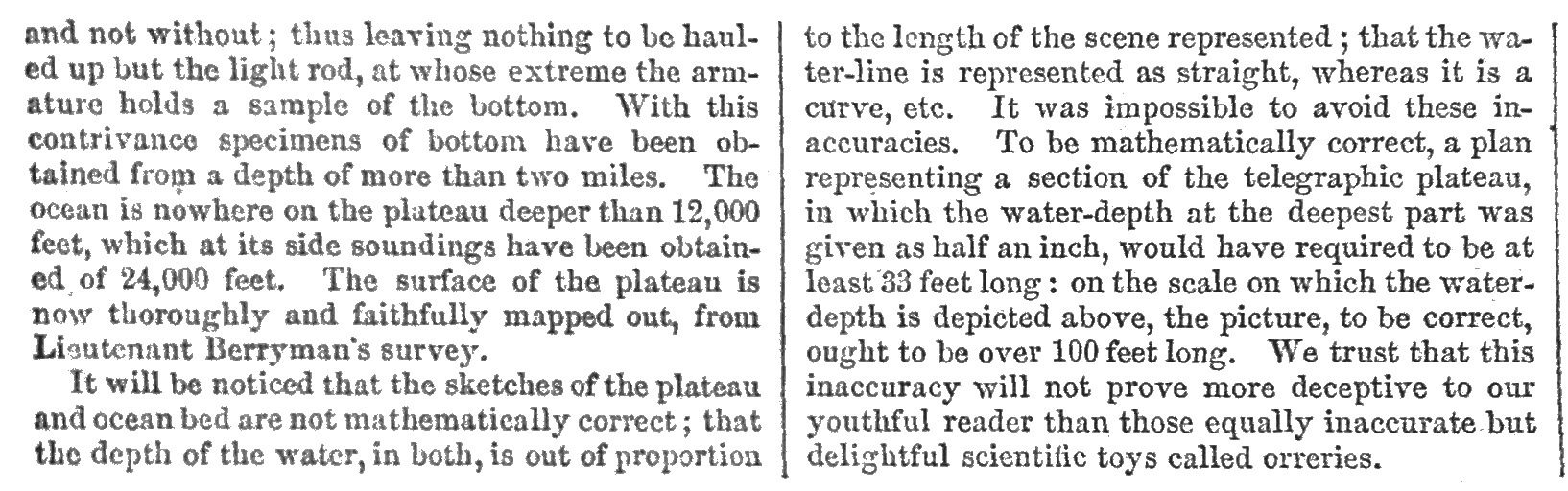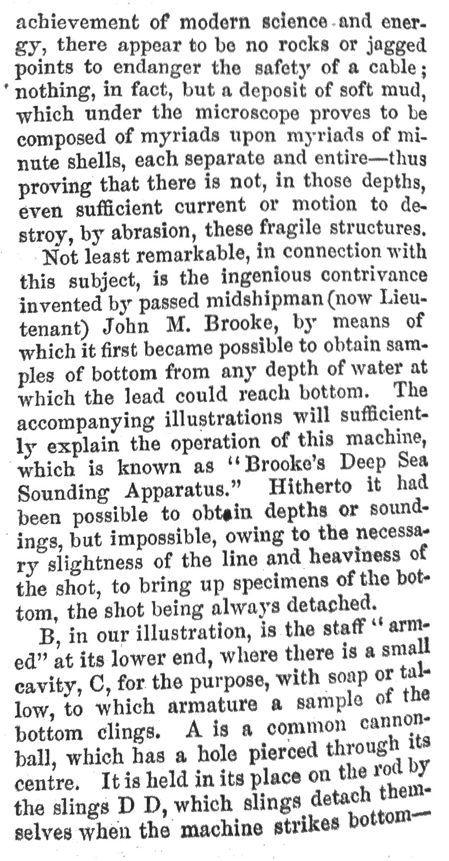 The article combined a layman’s explanation of the information through specific and plain diction and more scientific and technical information about the process for the more scientific-minded audience. According to the author, “in the ocean depths there is an absolute absence of current or motion of any kind—so the wire . . . is in no danger of its destruction by abrasion or chafe against the bottom surface” (“Telegraph” 548). Lieutenant Berryman of the U.S. steamer, Artic, obtained soundings, confirming that the soft mud bed contained “myriads upon myriads of minute shells, each separate and entire” (“Telegraph” 548), proving the lack of any destructive current. This plain diction in layman’s terminology was directed at the general audience. A highly technical and scientific description of how Brooke’s Deep Sea Instrument worked was presented, using technical, precise, and specific diction to explain the sounding procedure which would appeal to mainly a scientific-minded audience. For example, “the staff armed . . . where there is a small cavity . . . with soap or tallow, to which armature a sample of the bottom clings” (“Telegraph” 548). In an appeal to the wider general audience, vibrant imagery with dramatic and exciting diction concluded the article with the ship, Agamemnon, battling “a terrible storm” (“Telegraph” 549) while laying a cable. As the wind “continued to blow hard, with frequent violent squalls, the sea running tremendously high . . . no one expected the cable to hold” (“Telegraph” 549-550), but the weather improved and the cable was successfully laid.